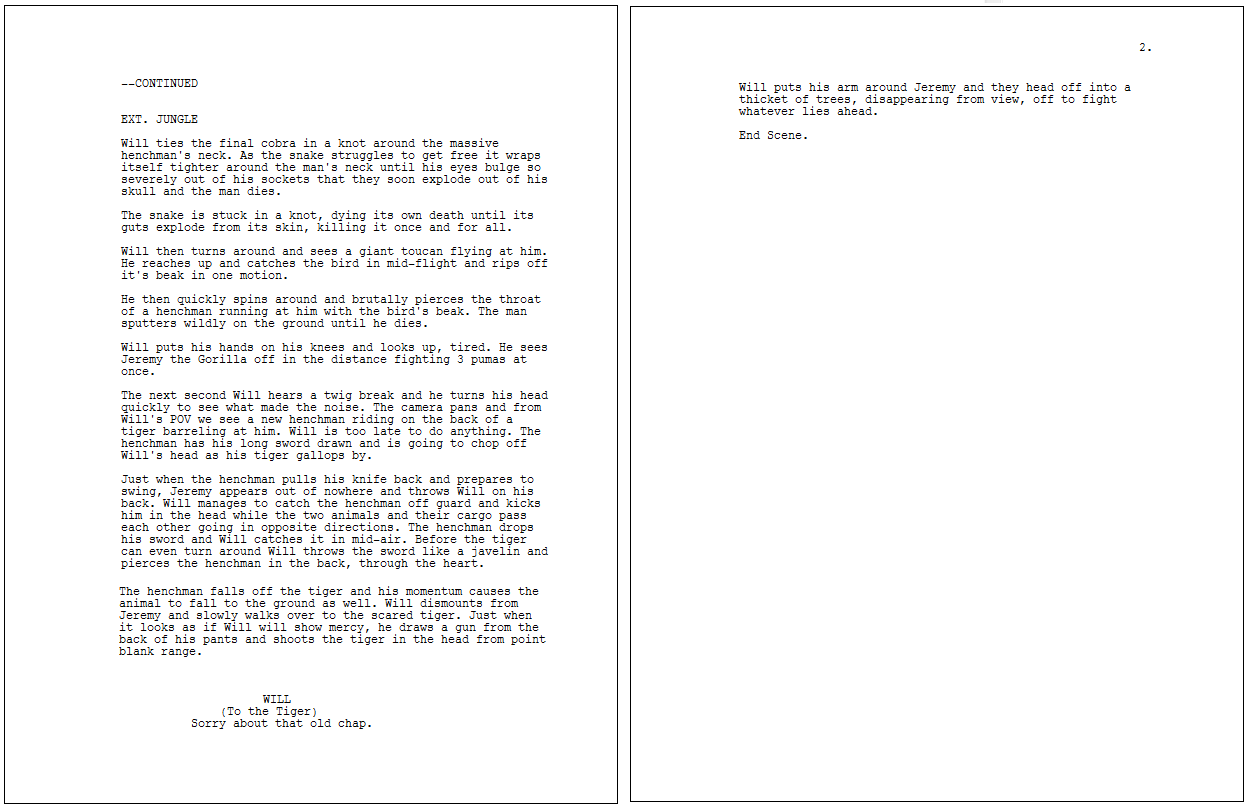 Together with Jeremy, Will uses his gun and other tools he’s built using jungle materials (a rudimentary cross-bow that he uses to shoot sharp pine needles through his enemies eyeballs, etc.) to attack the compound. It’s a furious battle with Will being attacked by men and animal in equal measure. Finally all the men are killed, Will is out of weaponry and ammo, and one final Tiger stands between him and the door to the compound. But this is the leader of the Tiger pack. The biggest, nastiest one of them all. And he’s pacing back and forth ready to pounce. Will and the Tiger face off and prepare to fight. Finally they launch themselves at each other and the Tiger jumps higher than Will could have ever expected. Will is going to be clobbered to death. But just as the Tiger’s lunge is about to crush Will, Jeremy jumps out of nowhere and takes the brunt of the Tiger’s attack himself. Using this split-second distraction Will punches the tiger in the face to death. He then moves to Jeremy, who’s lying on the ground breathing heavily. The gorilla dies as Will cradles him in his arms.