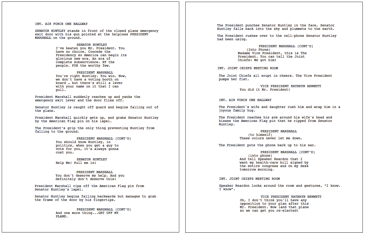 Believing the President exited the plane via escape pod, Senator Huntley makes his demands: The President must concede the election or he will kill everyone left on board Air Force One.