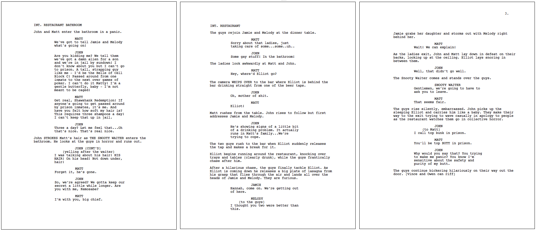 The guys realize they can’t leave the alien alone in their apartment, but they’re also desperately in need of a greasy breakfast after their night out. So they dress the alien up as a small human child and hit the local diner. At the diner, two women come over to them and coo over their “adorable little boy” as they compliment John and Matt on being gay parents together (which makes John and Matt hilariously uncomfortable). Walking home, the two guys discuss how many chicks this little guy could help them get….And so, their decision is made: They’re going to enroll the alien in school and pretend to be his gay dads to get women… Let the hilarity begin.