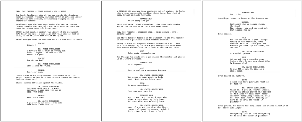 On January 1st, 2019, Dr. Jacob Gunslinger realizes he was wrong. There’s no sign of a pandemic. His data was faulty. His data is never faulty. But somehow it was. He has a blowup fight with his girlfriend. He goes to Central Park, sits down on a park bench, and has his first drink in 5 years. In the sky, he notices a bat swooping low over the park. Curious…